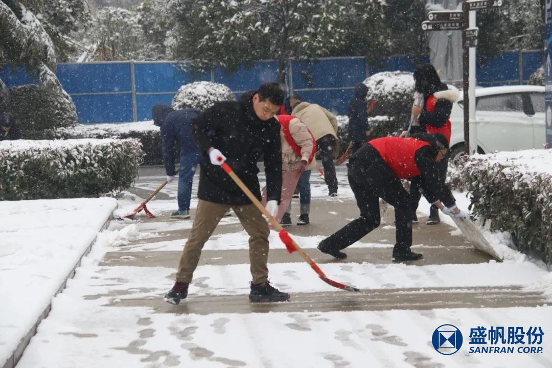 在困難面前,盛帆黨總支50余位黨員以雪為令、冒雪逆行,修剪被積雪壓垮的樹枝、清掃道路積雪,確保盛帆園區(qū)道路通暢,保障員工及家屬出行安全。在風(fēng)雪中為人民群眾筑起一道道堅(jiān)固的“紅色堡壘”,讓黨旗在除雪保暢一線高高飄揚(yáng),讓黨徽在除雪保暢一線熠熠生輝!