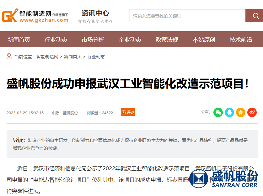 近日,武漢市經(jīng)濟和信息化局公示了2022年武漢工業(yè)智能化改造示范項目,武漢盛帆電子股份有限公司申報的“電能表智能化改···